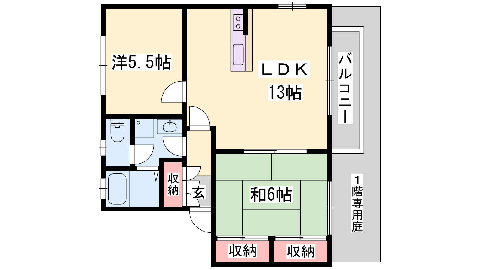 - LDK13帖、洋室5.5帖、和室6帖