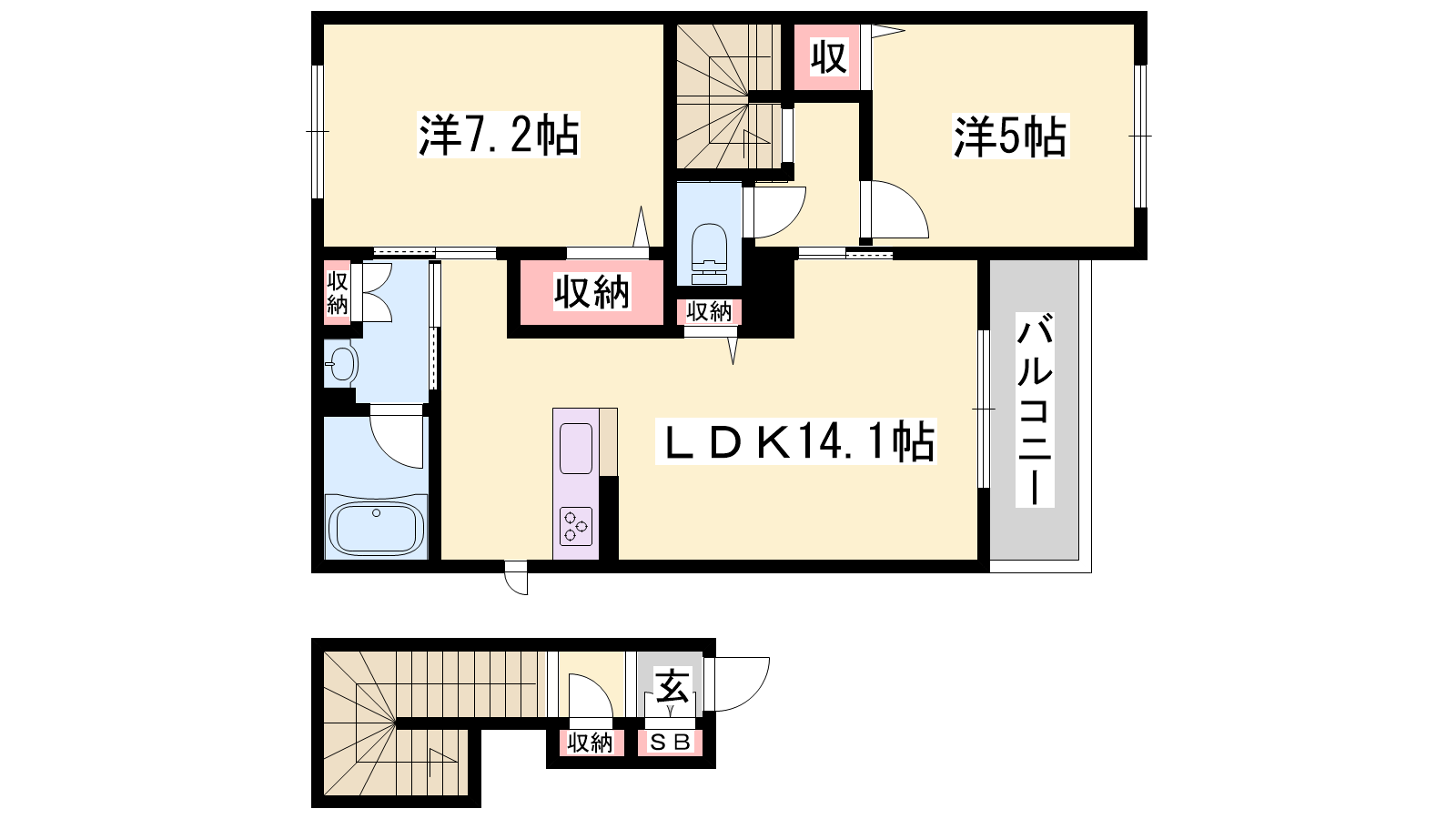 - LDK14.2帖、洋室7.2帖、洋室5帖