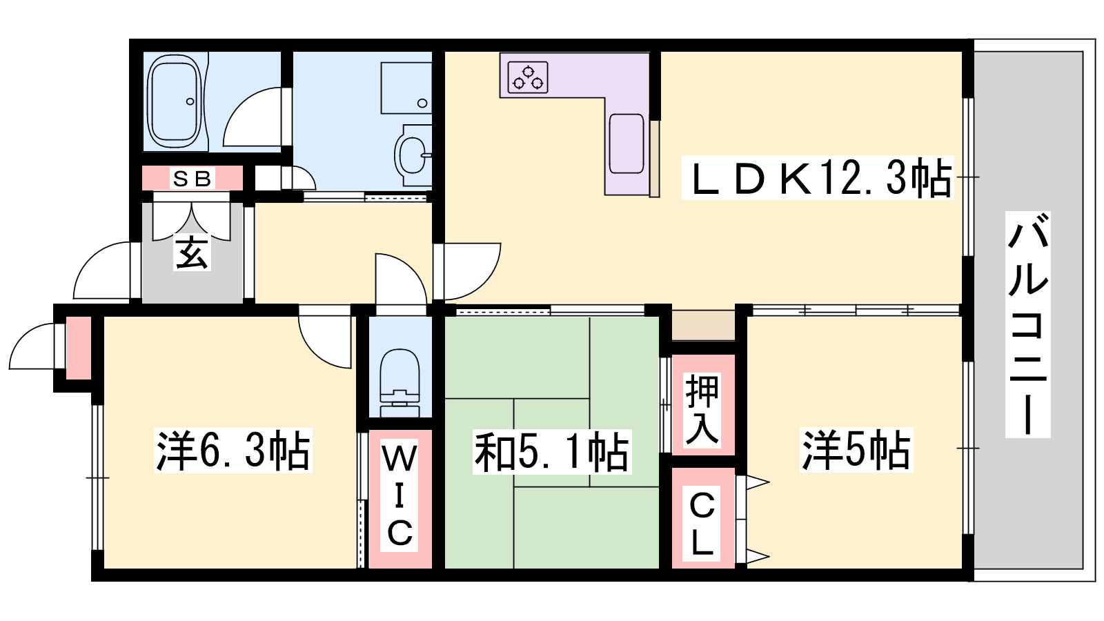 - LDK12.3帖、洋室6.3帖、洋室5.1帖、和室5帖