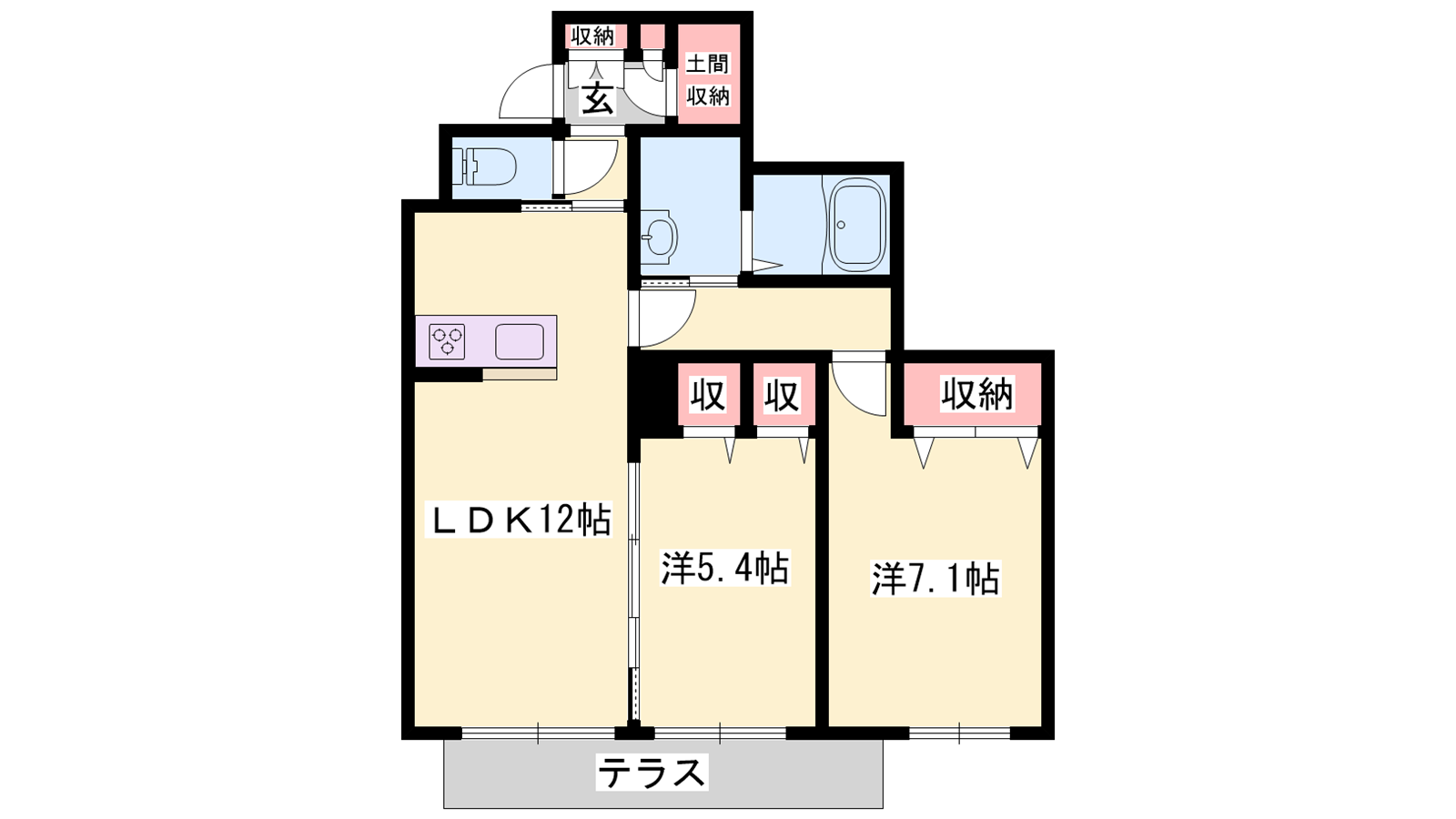 - LDK12帖、洋室7.1帖、洋室5.4帖