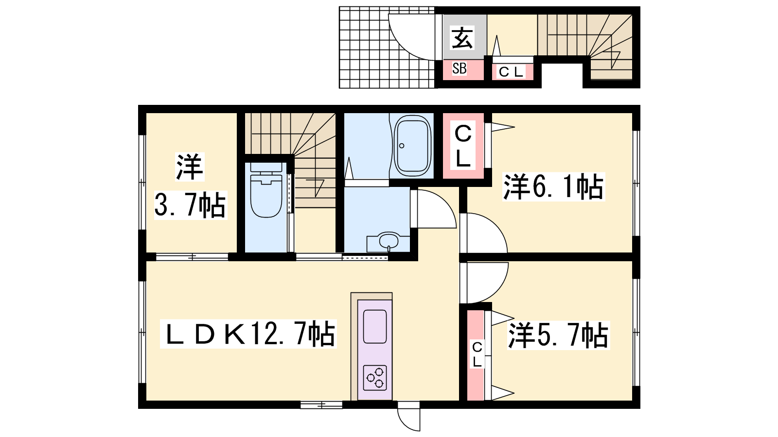 - LDK12.7帖、洋室6.1帖、洋室5.7帖、洋室3.7帖
