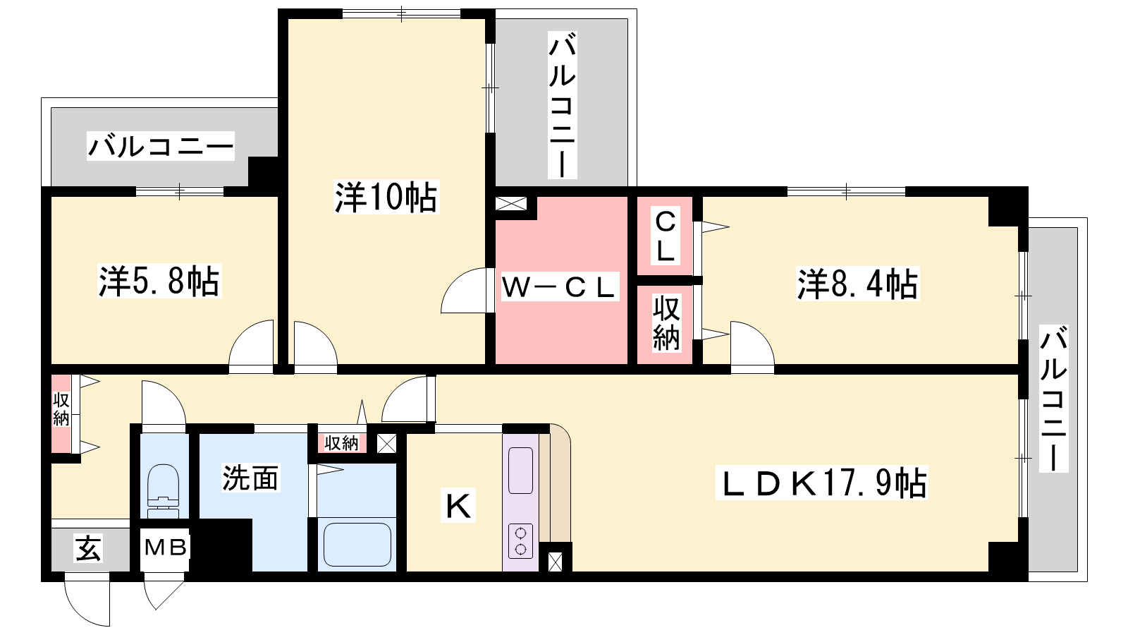 - LDK17.9帖、洋室10帖、洋室8.4帖、洋室5.8帖