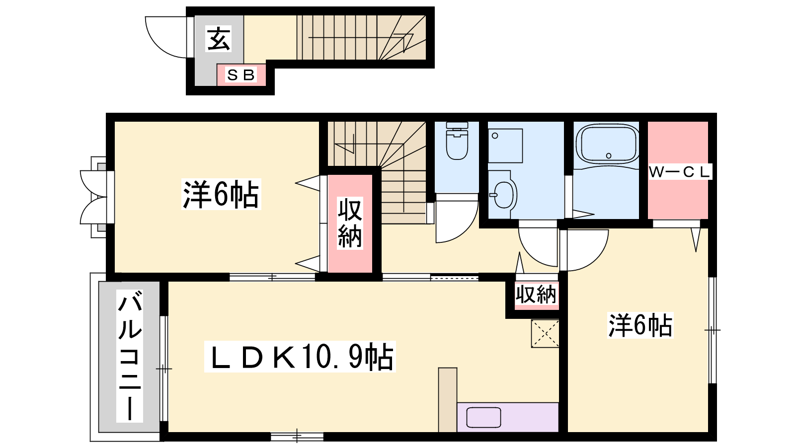 - LDK10.9帖、洋室6帖、洋室6帖