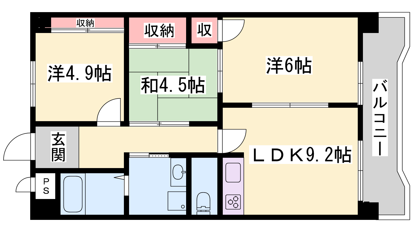 - LDK9.2帖、洋室4.9帖、和室4.5帖、洋室6帖