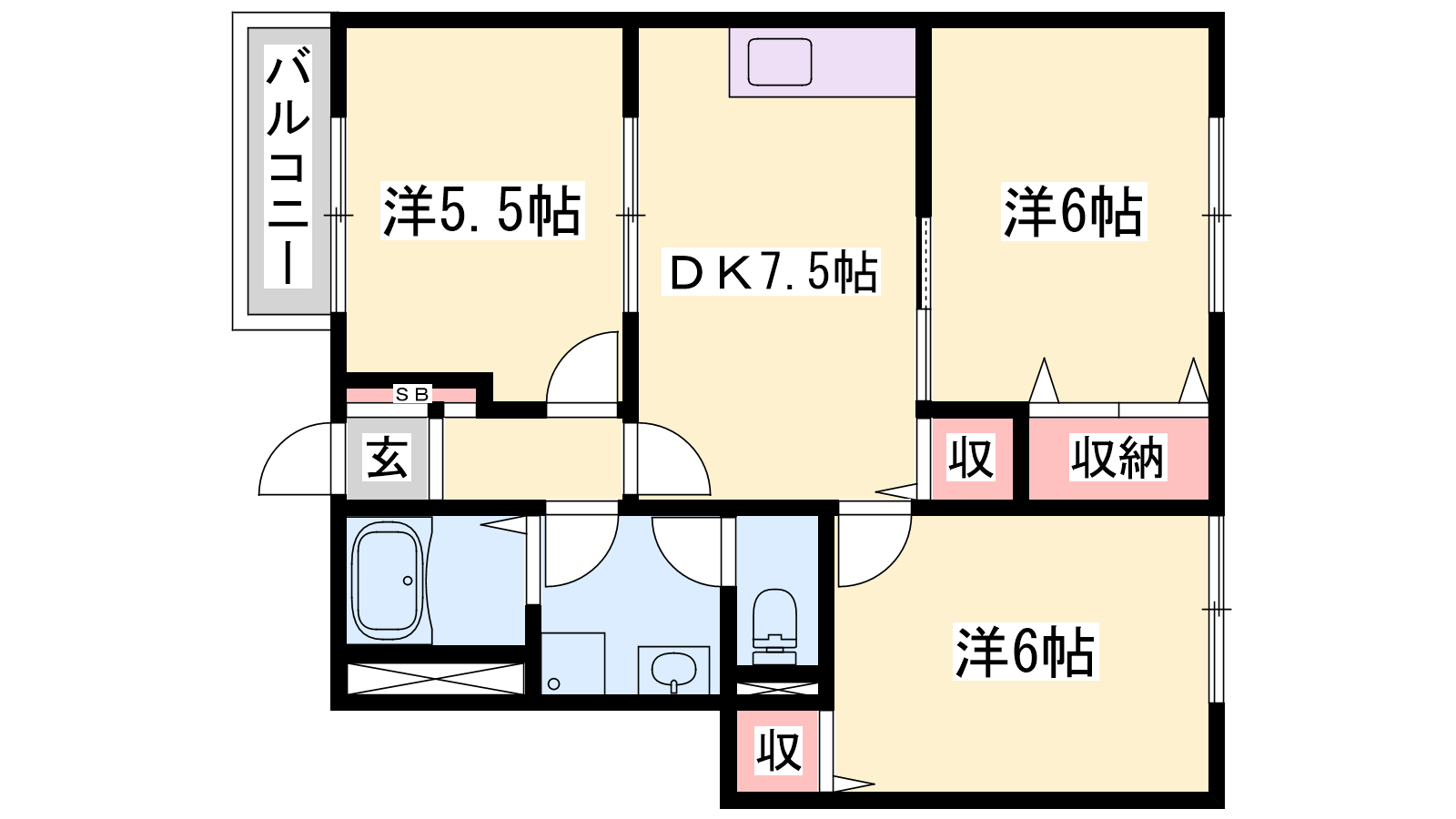 - DK7.5帖、洋室6帖、洋室6帖、和室5.5帖
