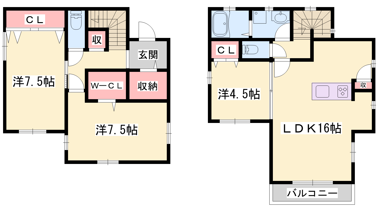 - LDK16帖、洋室7.5帖、洋室7.5帖、和室4.5帖