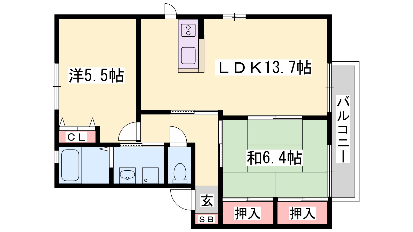 - LDK13.7帖、洋室5.5帖、和室6.4帖