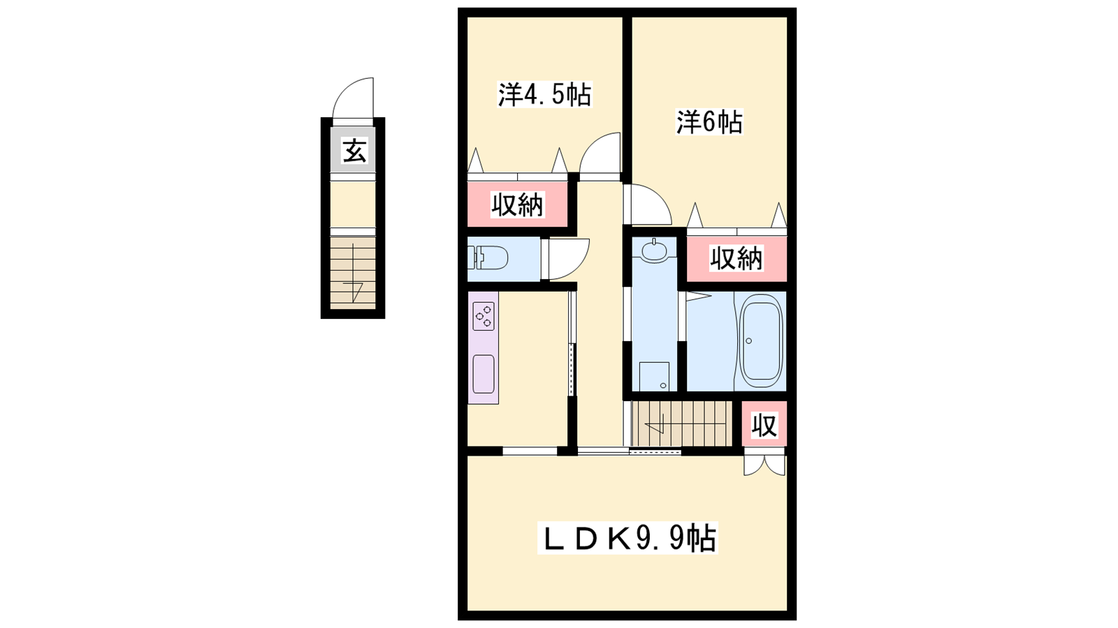 - LDK9.9帖、洋室6帖、洋室4.8帖