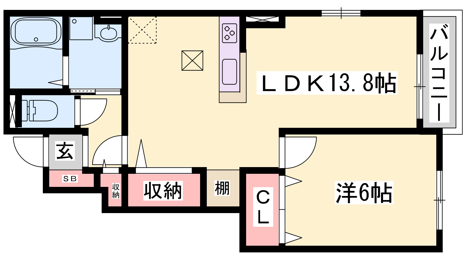 - LDK13.8帖、洋室6帖