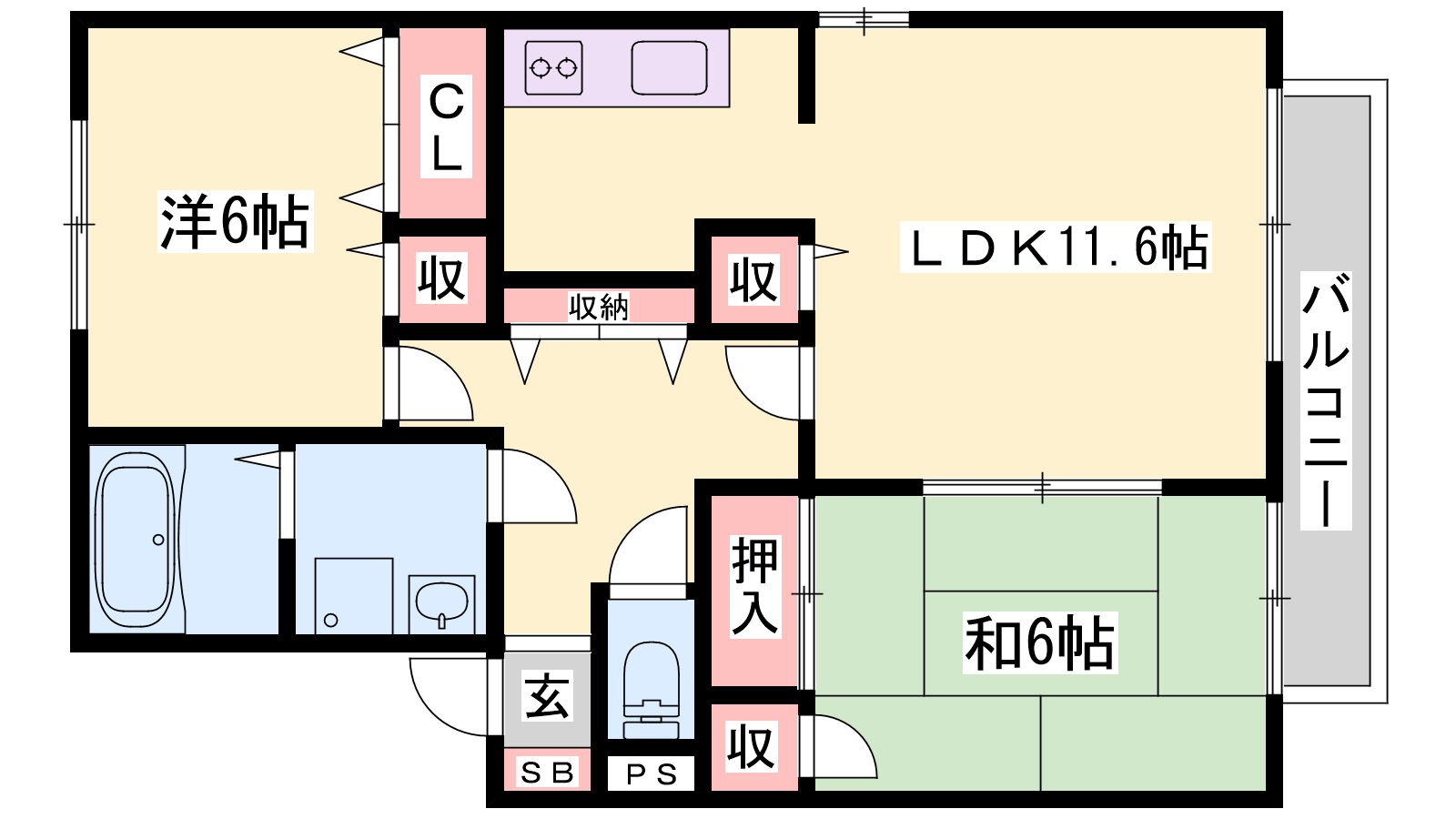 - LDK11.6帖、洋室6帖、和室6帖