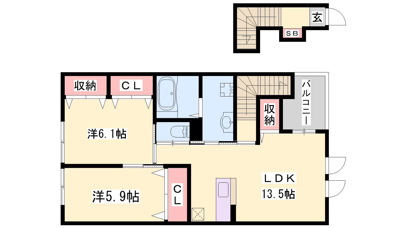 - LDK13.5帖、洋室6.1帖、洋室5.9帖