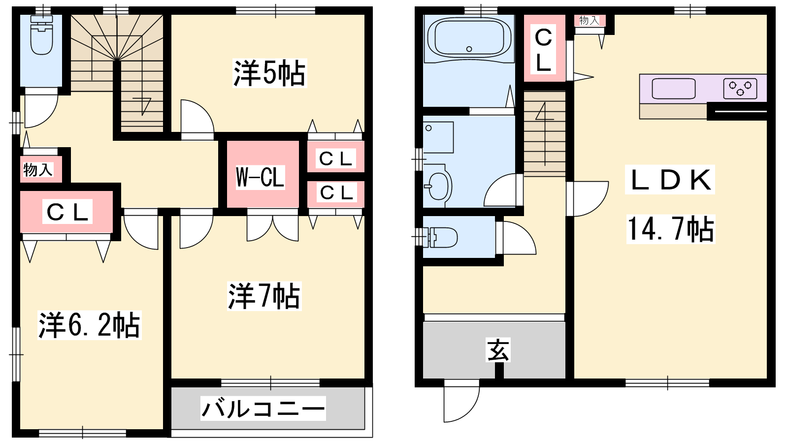 - LDK14.7帖、洋室5帖、洋室7帖、洋室6.2帖