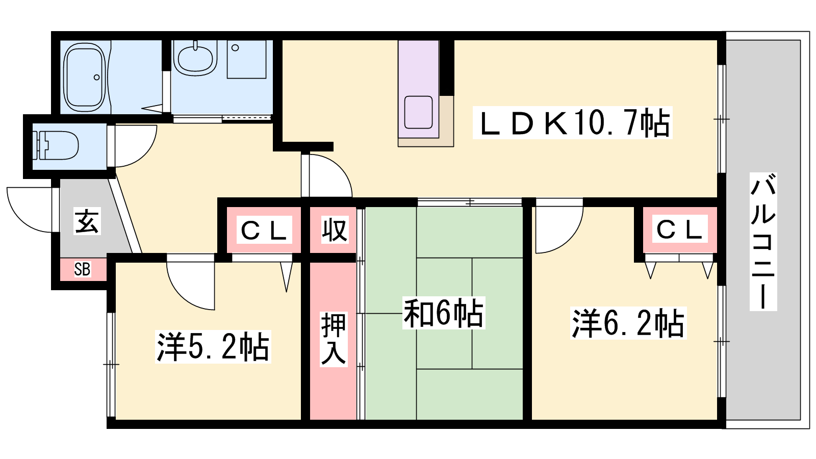 - LDK10.7帖、洋室6.2帖、和室6帖、洋室5.2帖