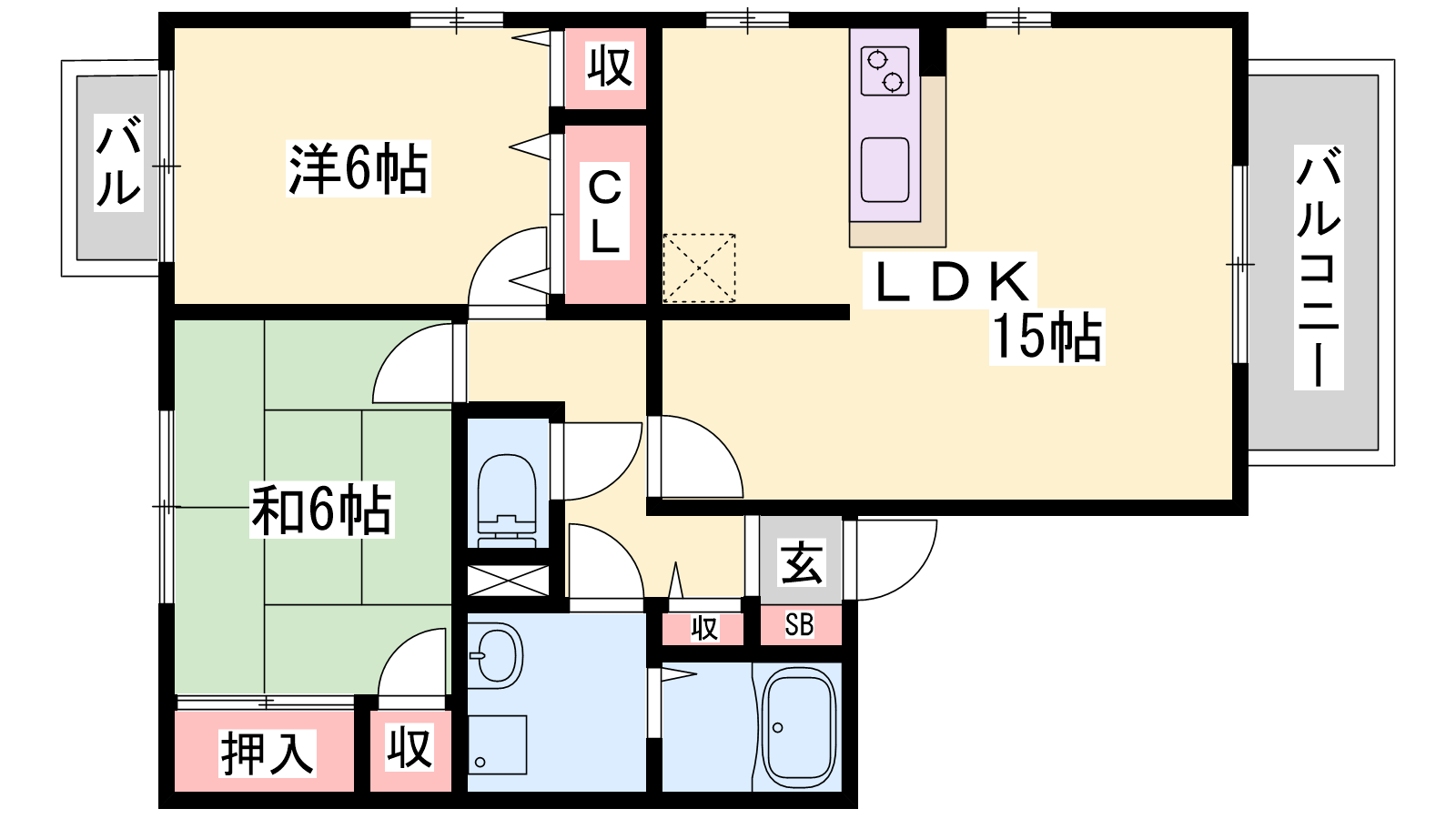 - LDK15帖、洋室6帖、洋室6帖
