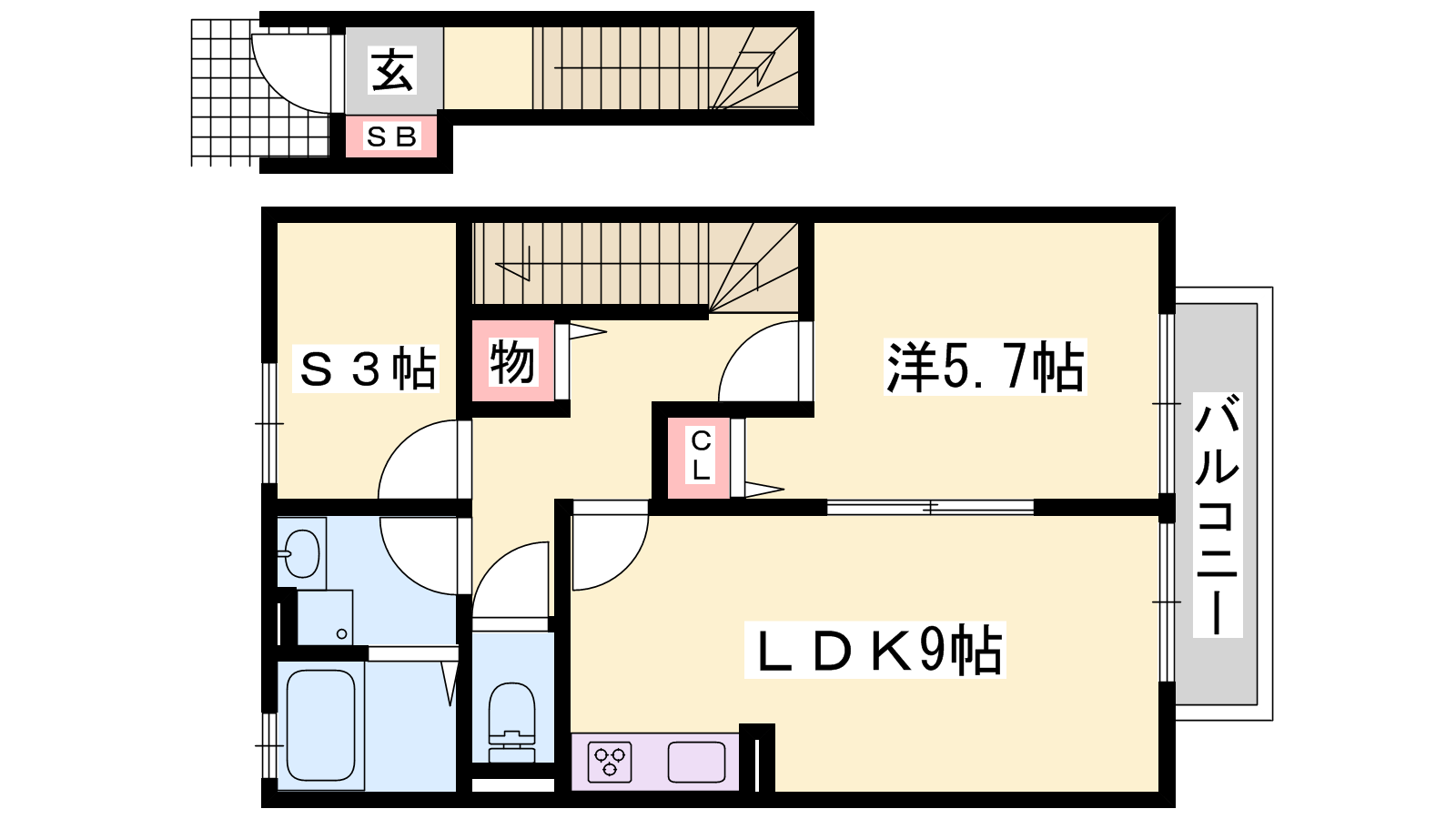 - LDK9帖、洋室5.7帖、S3帖