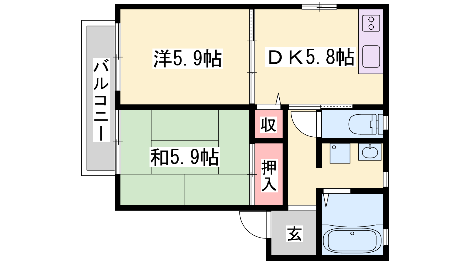 - DK5.8帖、洋室5.9帖、和室5.9帖