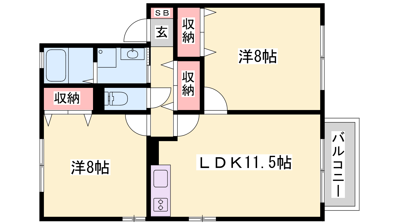 - LDK11.5帖、洋室8帖、洋室8帖