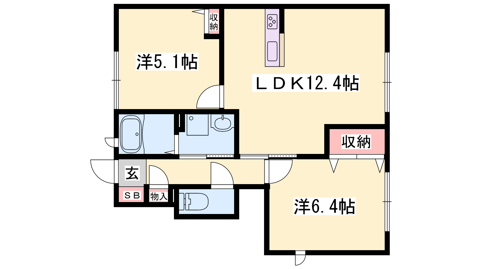 - LDK12.4帖、洋室5.1帖、洋室6.4帖