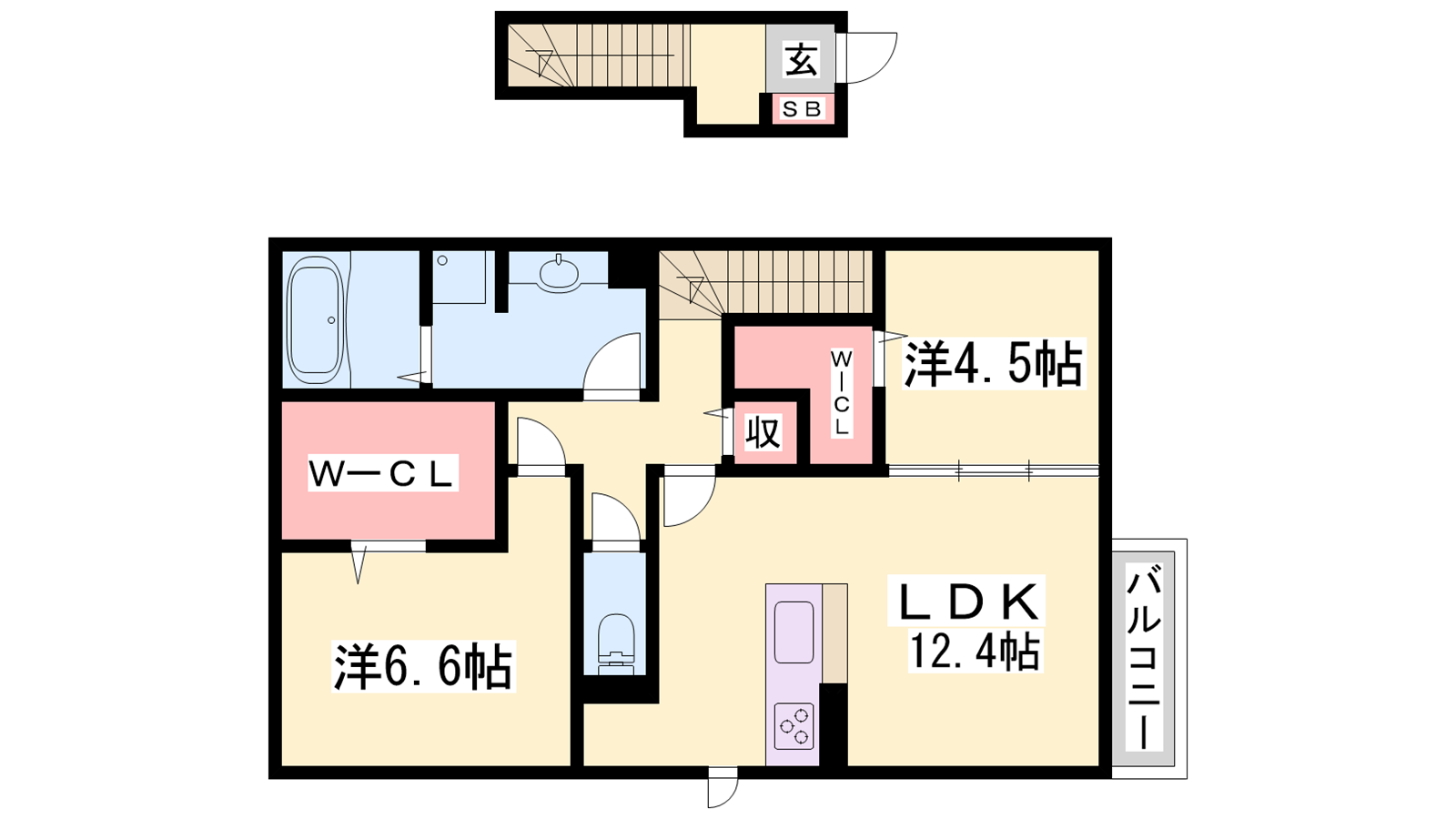 - LDK12.4帖、洋室6.5帖、洋室4.5帖
