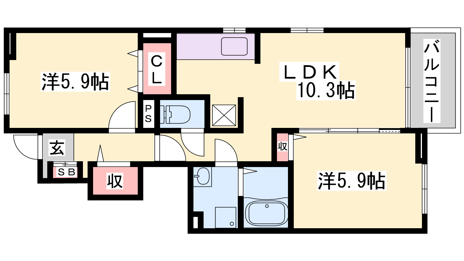 - LDK10.3帖、洋室5.9帖、洋室5.9帖