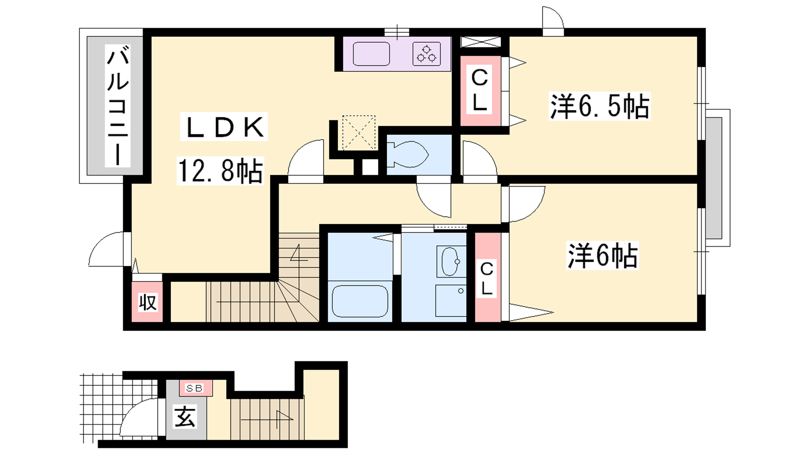 - LDK12.8帖、洋室6帖、洋室6.5帖
