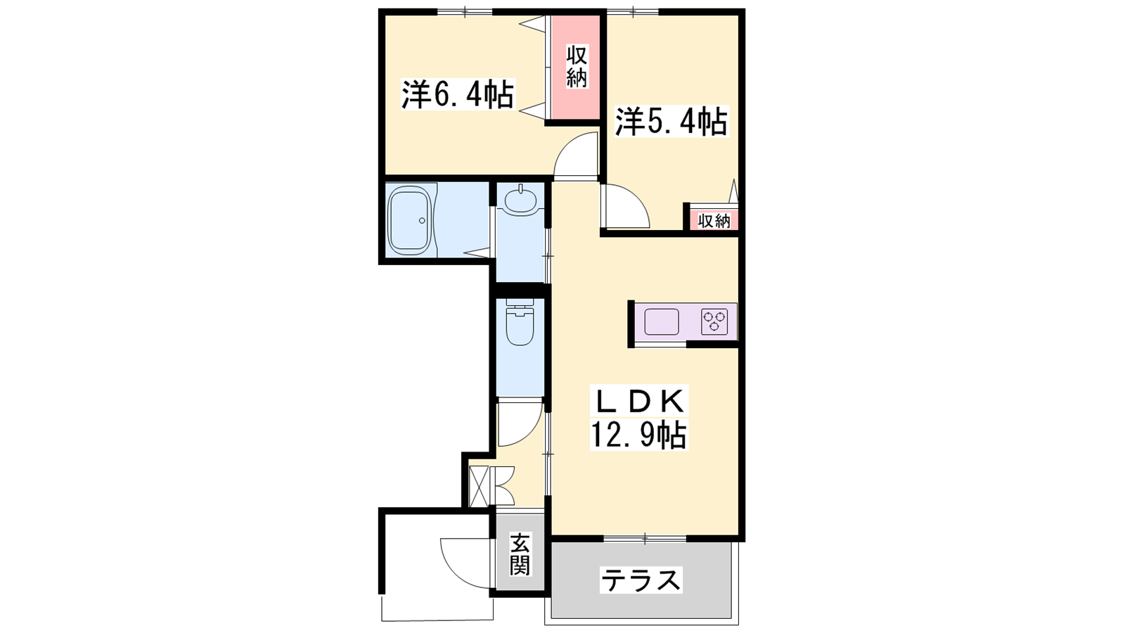 - LDK12.9帖、洋室6.4帖、洋室5.4帖