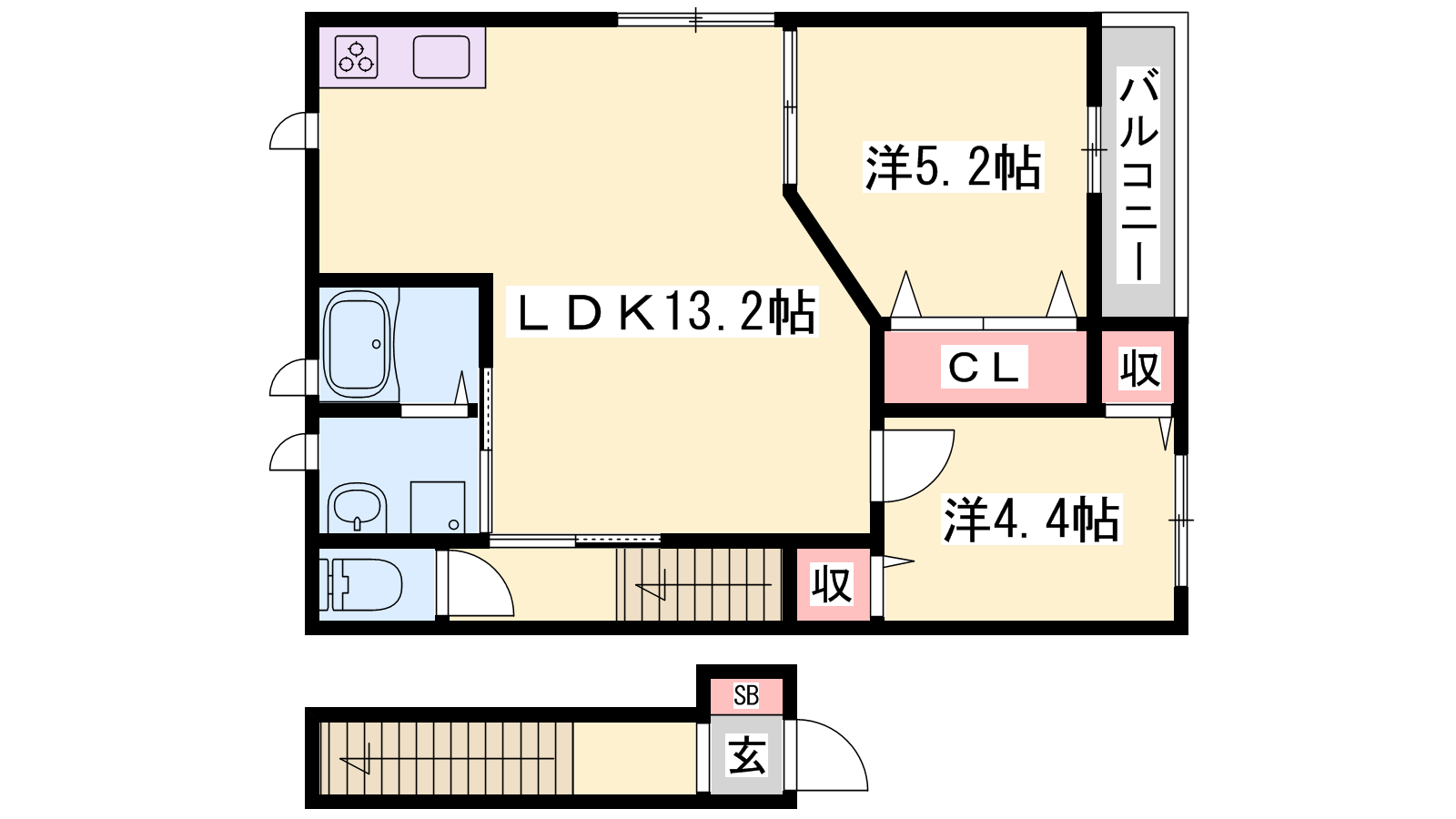 - LDK13.2帖、洋室5.2帖、洋室4.4帖
