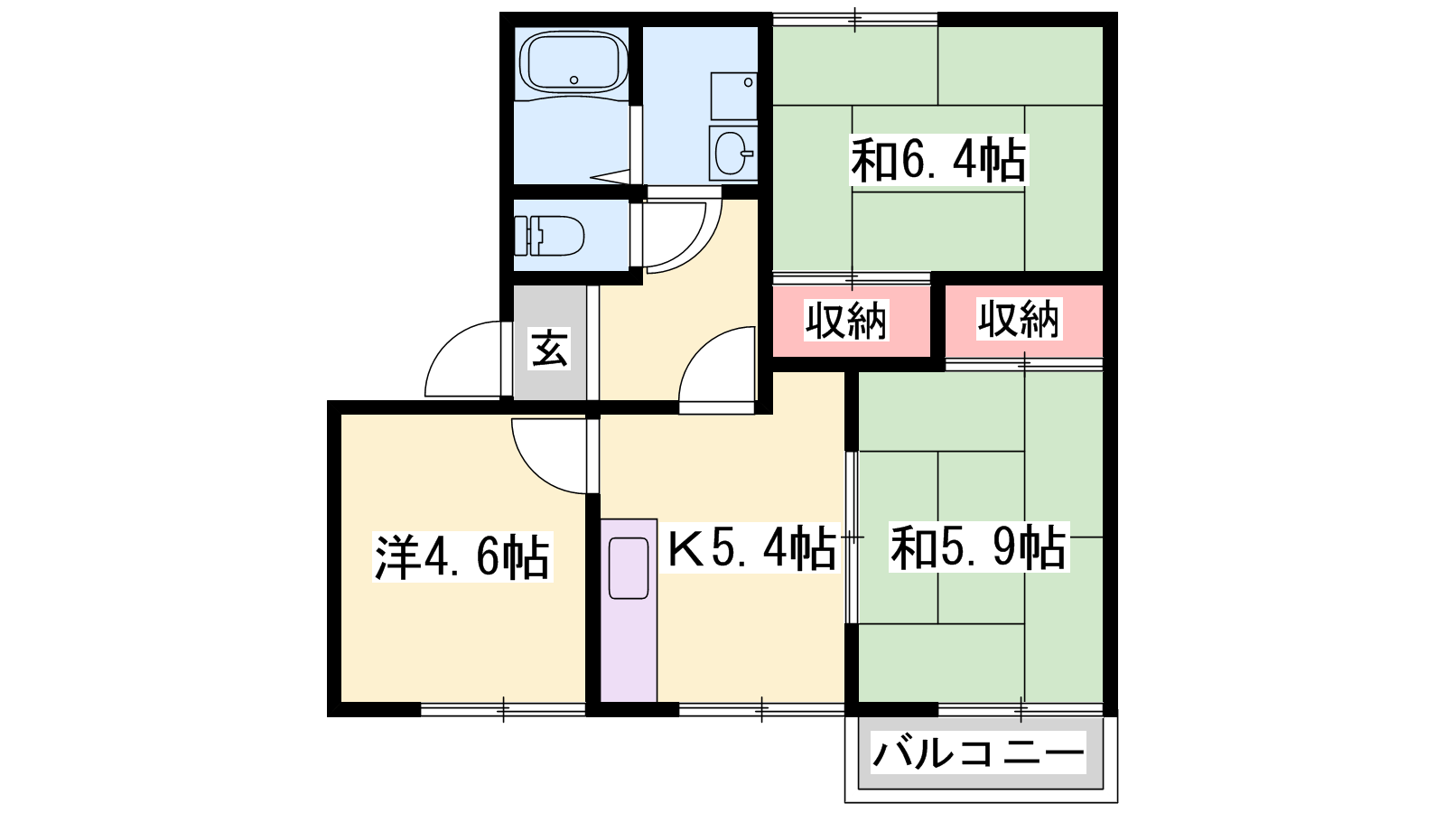 - K5.4帖、洋室4.6帖、和室6.4帖、和室5.9帖