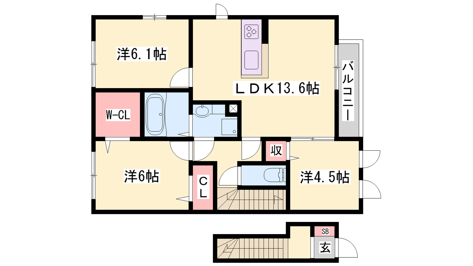 - LDK13.6帖、洋室6.1帖、洋室6帖、洋室4.5帖