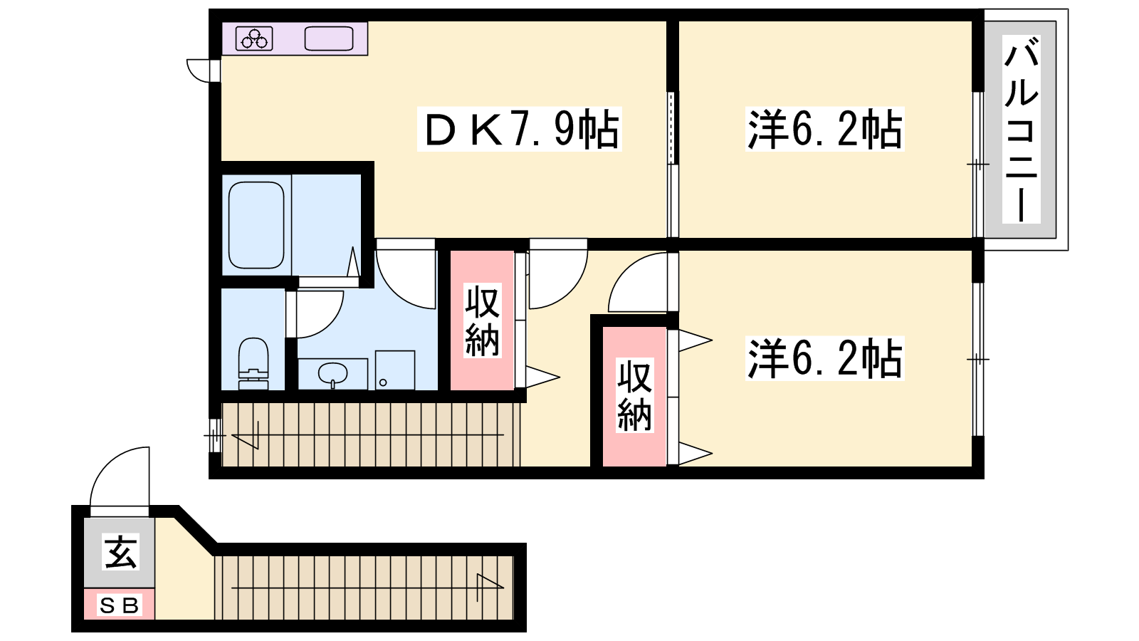 - DK7.9帖、洋室6.2帖、洋室6.2帖