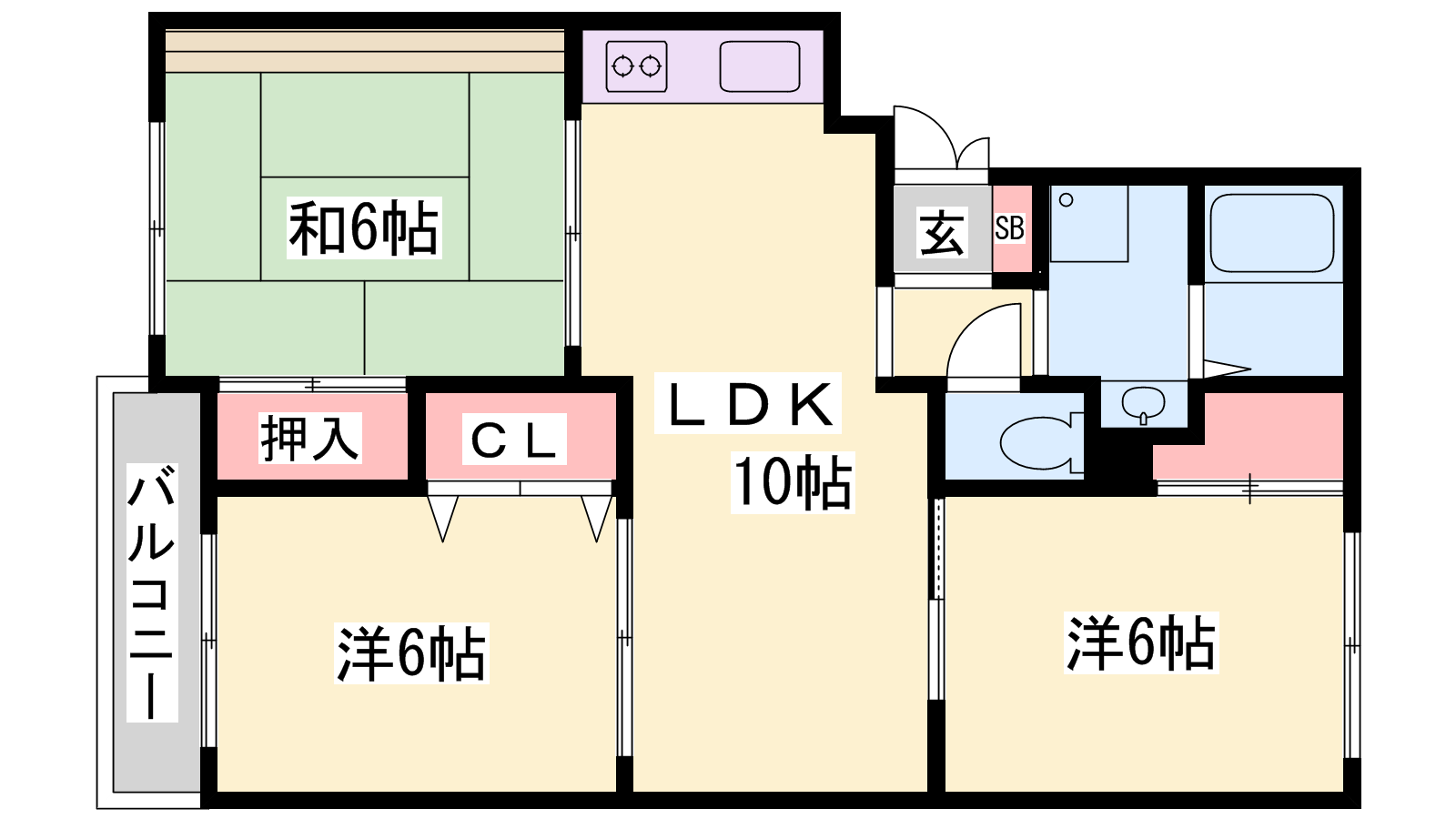 - LDK10帖、洋室6帖、洋室6帖、和室6帖