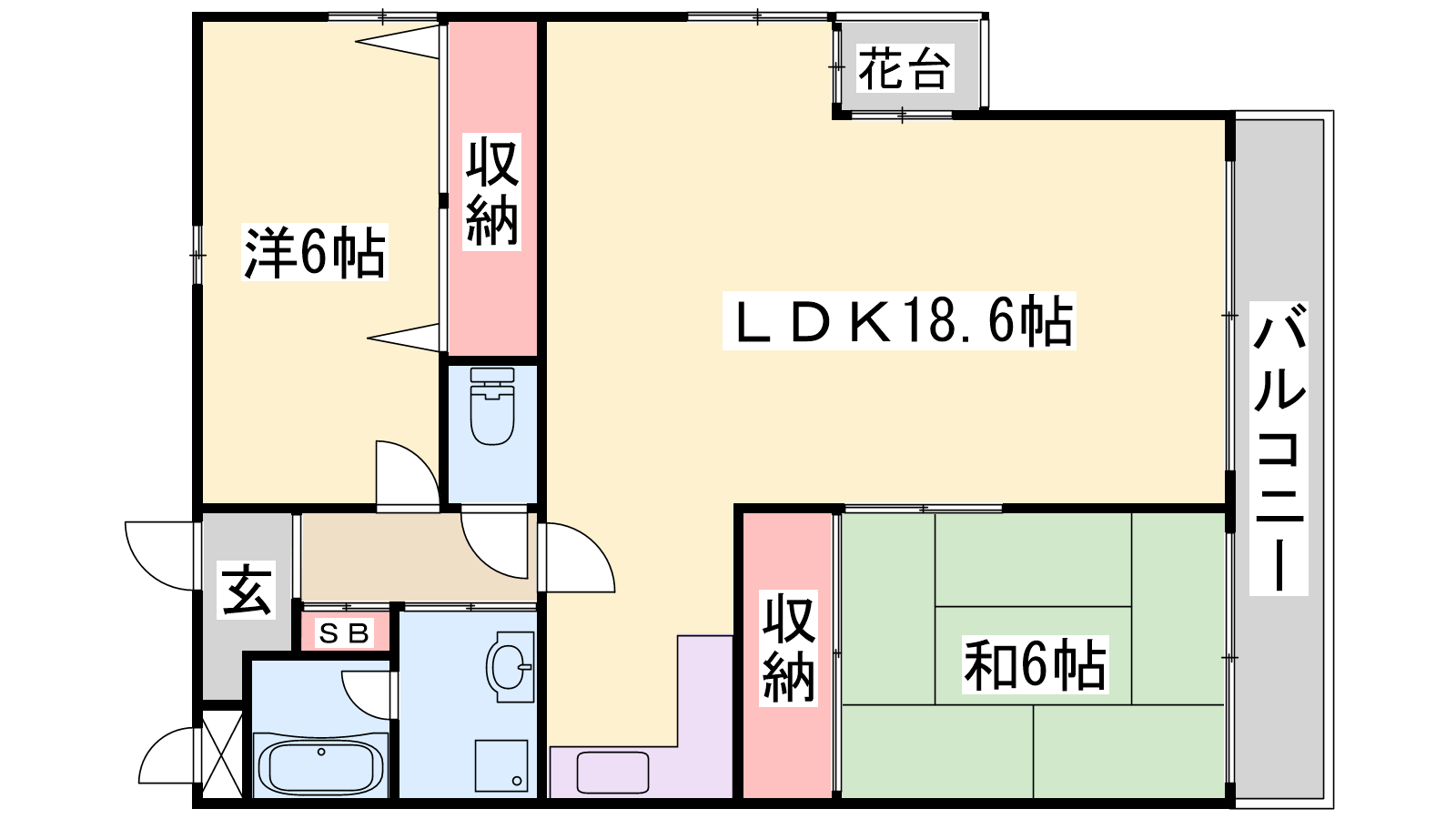 - LDK18.6帖、洋室6帖、和室6帖