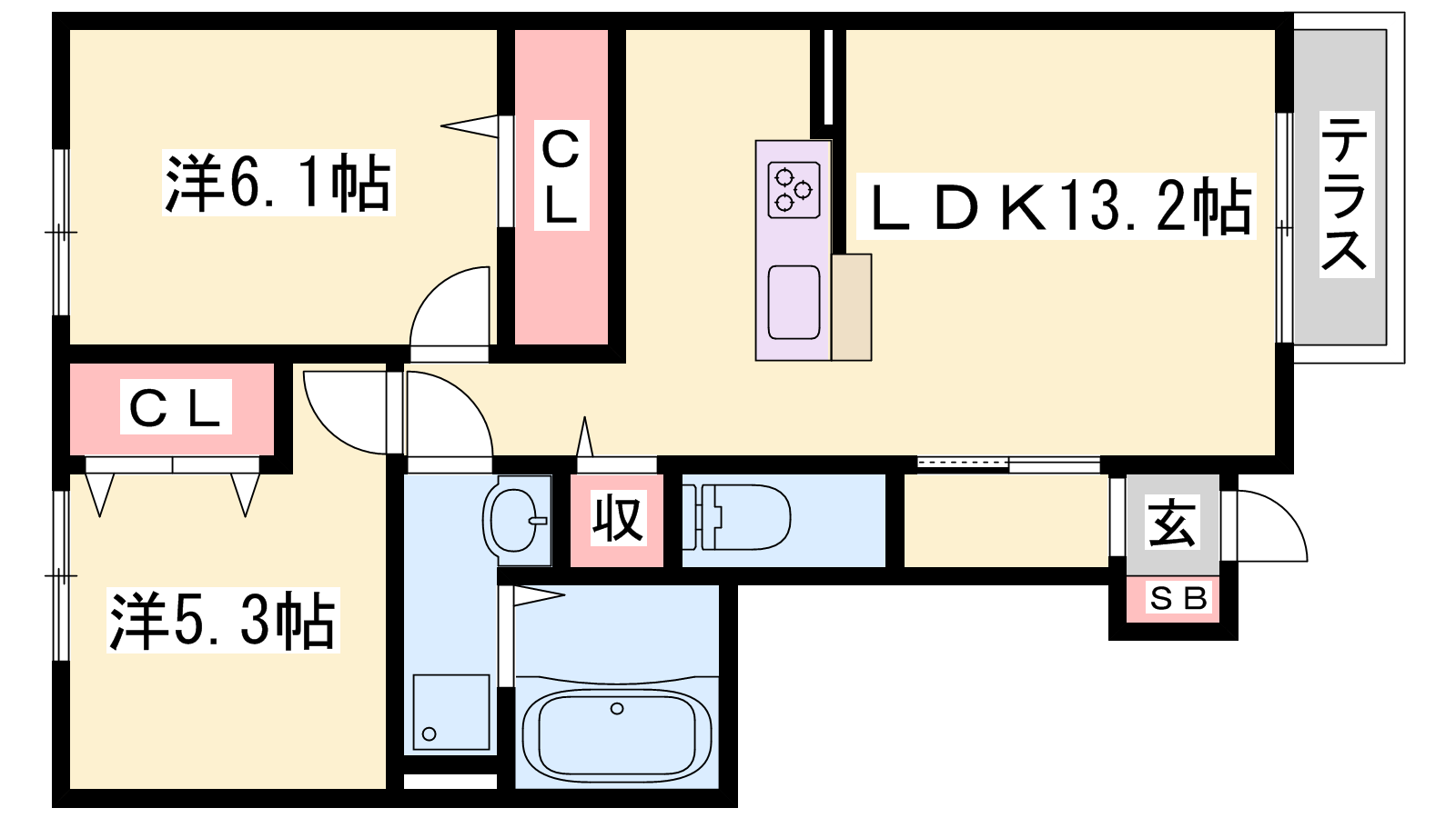 - LDK13.2帖、洋室6.1帖、洋室5.3帖