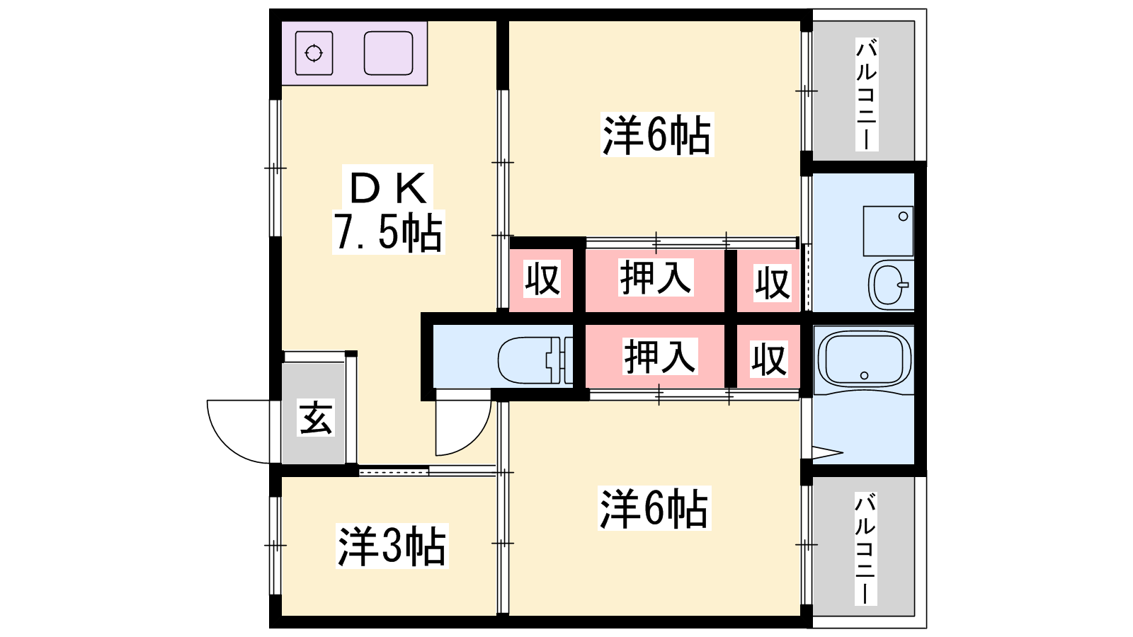 - DK7.5帖、洋室6帖、洋室6帖、洋室3帖