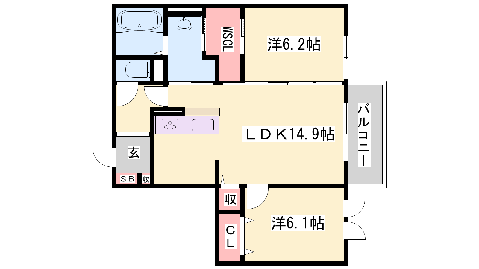 - LDK14.9帖、洋室6.2帖、洋室6.1帖