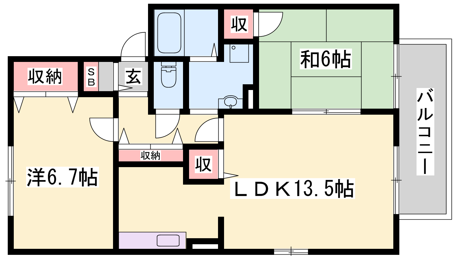 - LDK13.5帖、洋室6.7帖、和室6帖