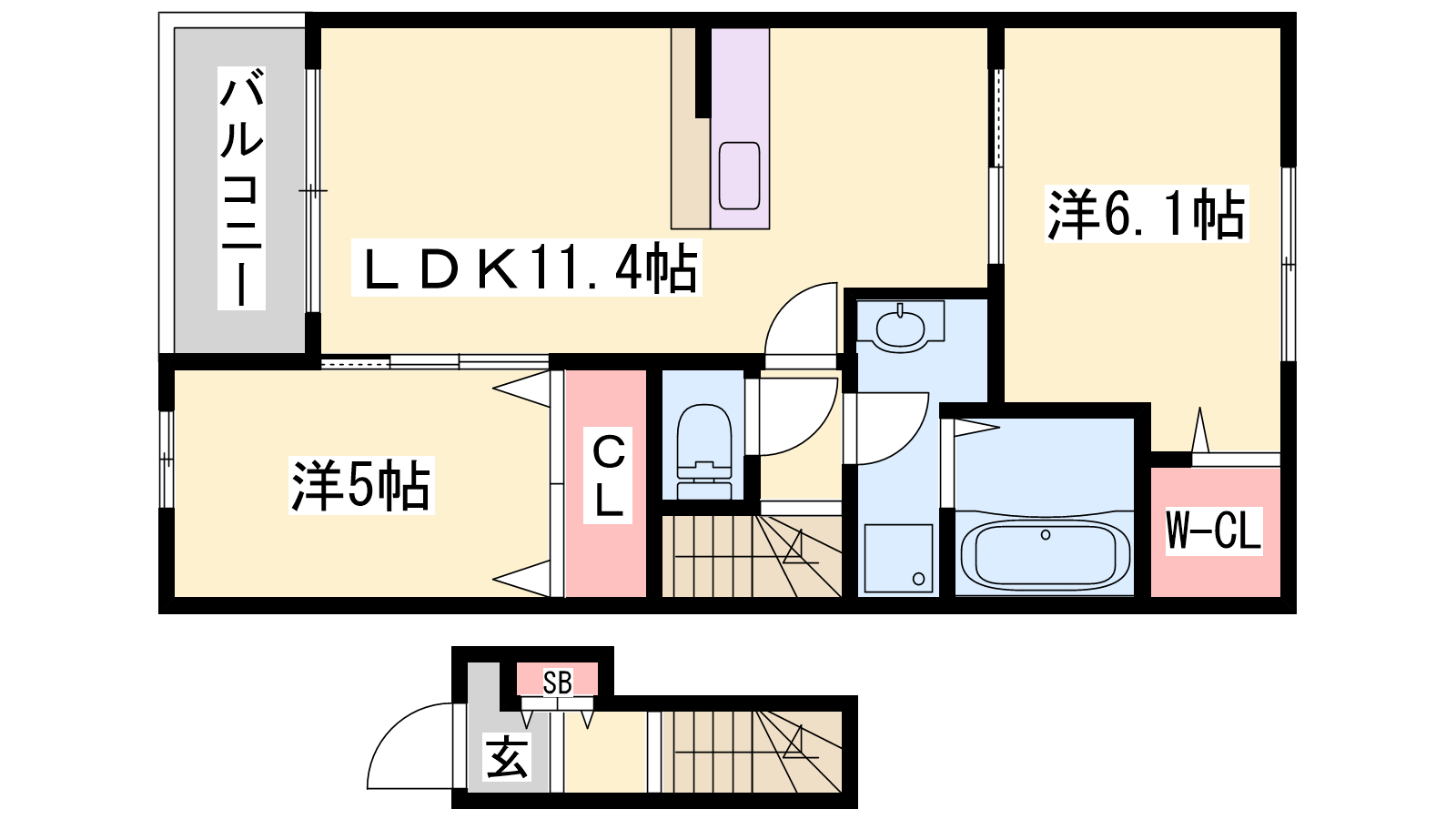 - LDK11.4帖、洋室6.1帖、洋室5帖
