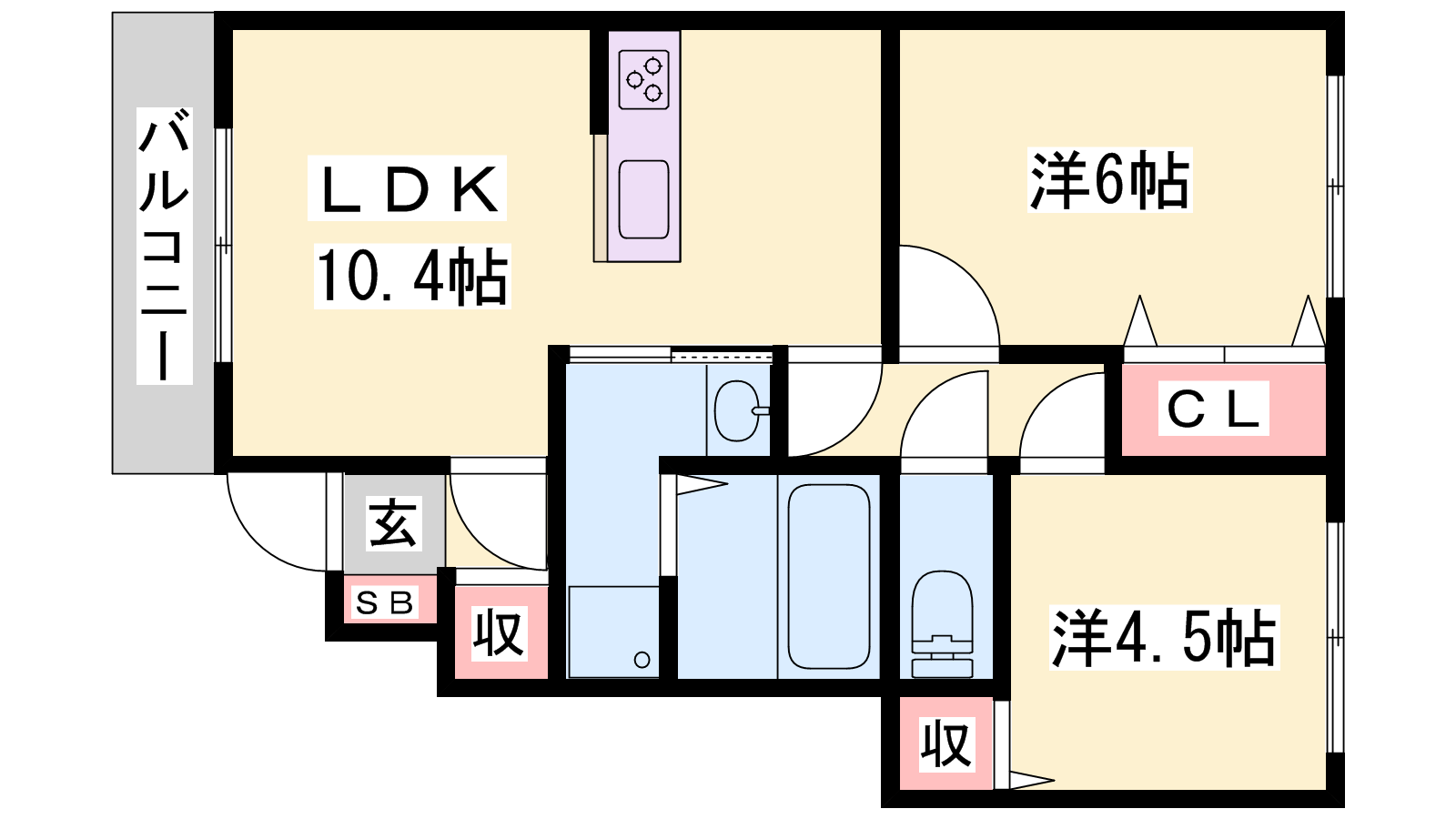 - LDK10.4帖、洋室6帖、洋室4.5帖