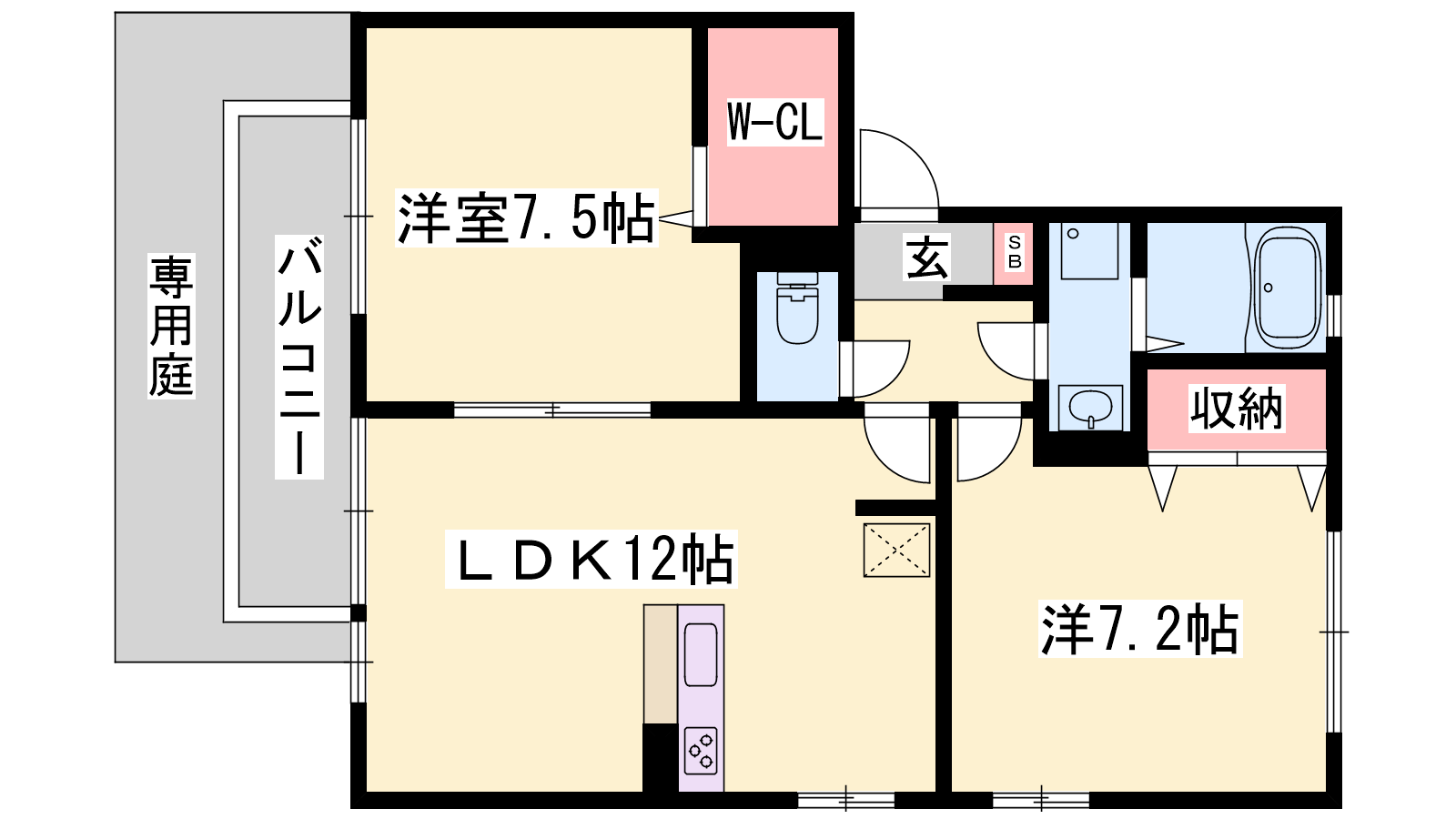 - LDK12帖、洋室7.5帖、洋室7.2帖