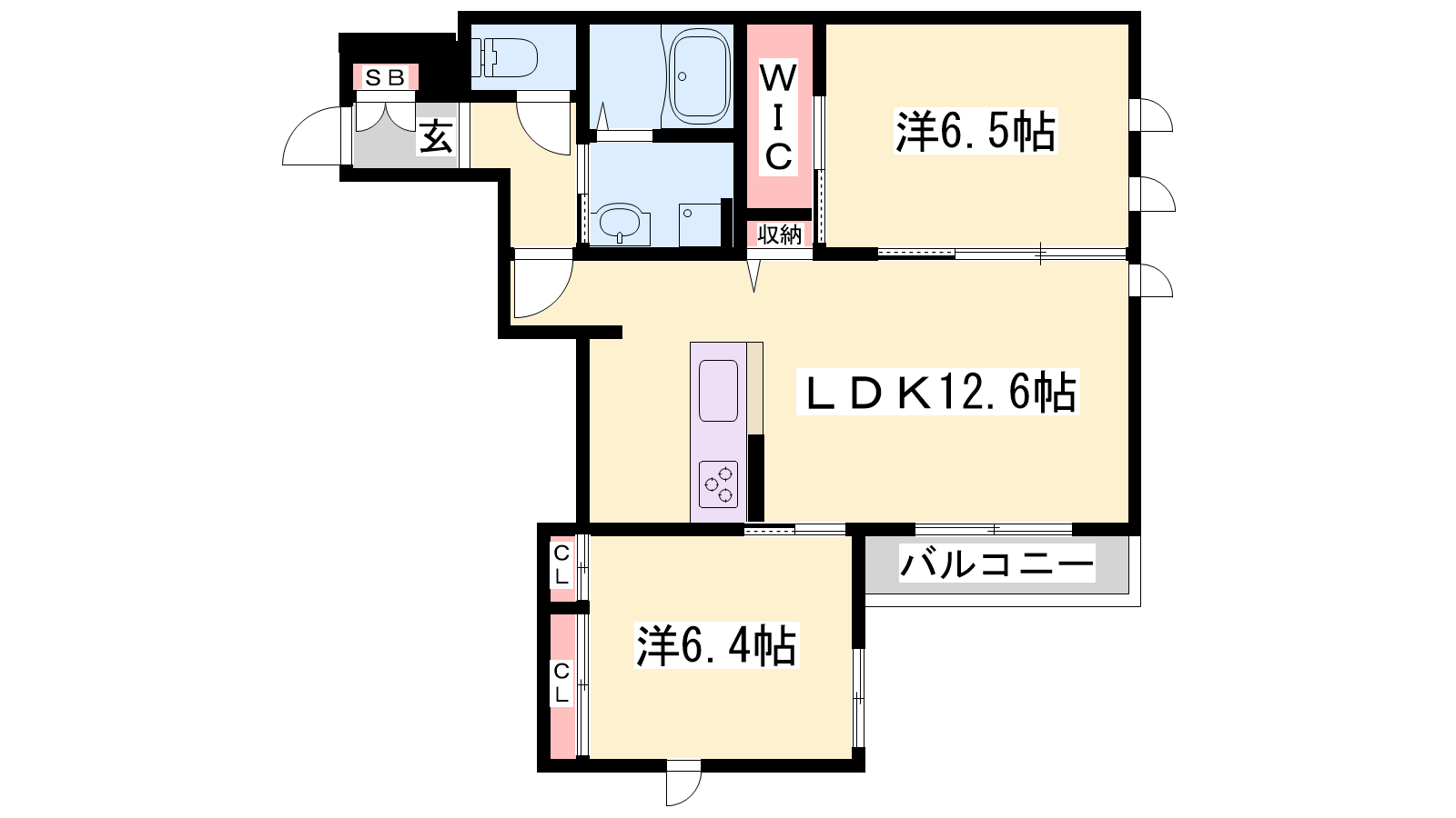 - LDK12.6帖、洋室6.5帖、洋室6.4帖
