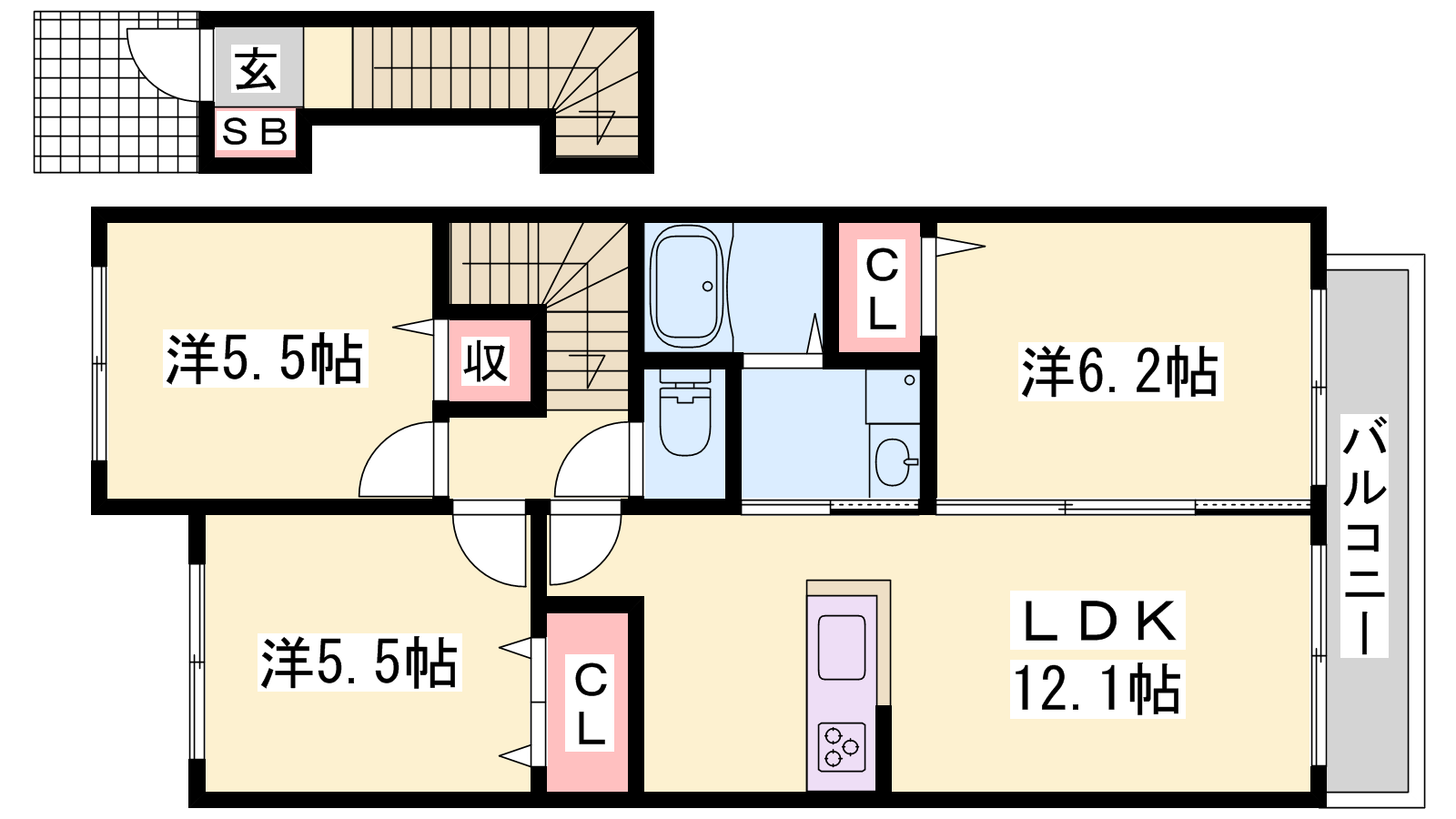 - LDK12.1帖、洋室6.2帖、洋室5.5帖、洋室5.5帖