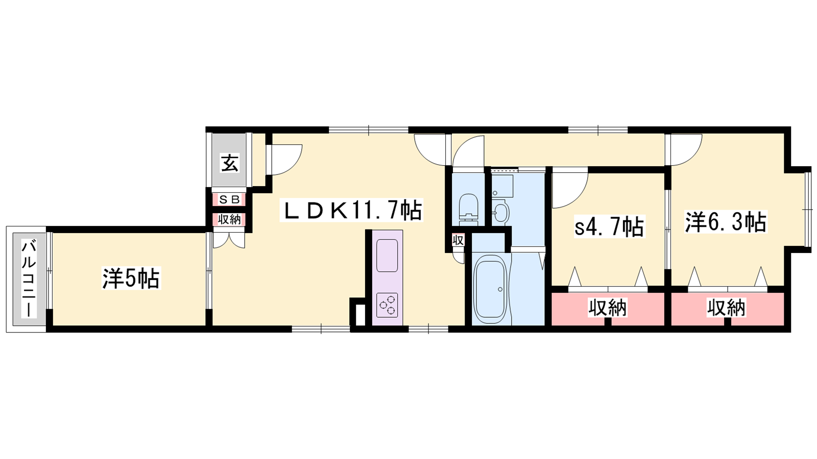 - LDK11.7帖、洋室6.3帖、洋室5帖、S4.7帖