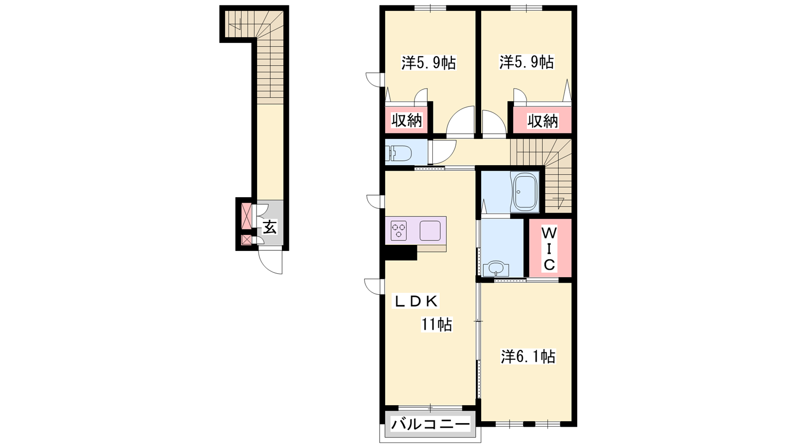 - LDK11帖、洋室6.1帖、洋室5.9帖、洋室5.9帖