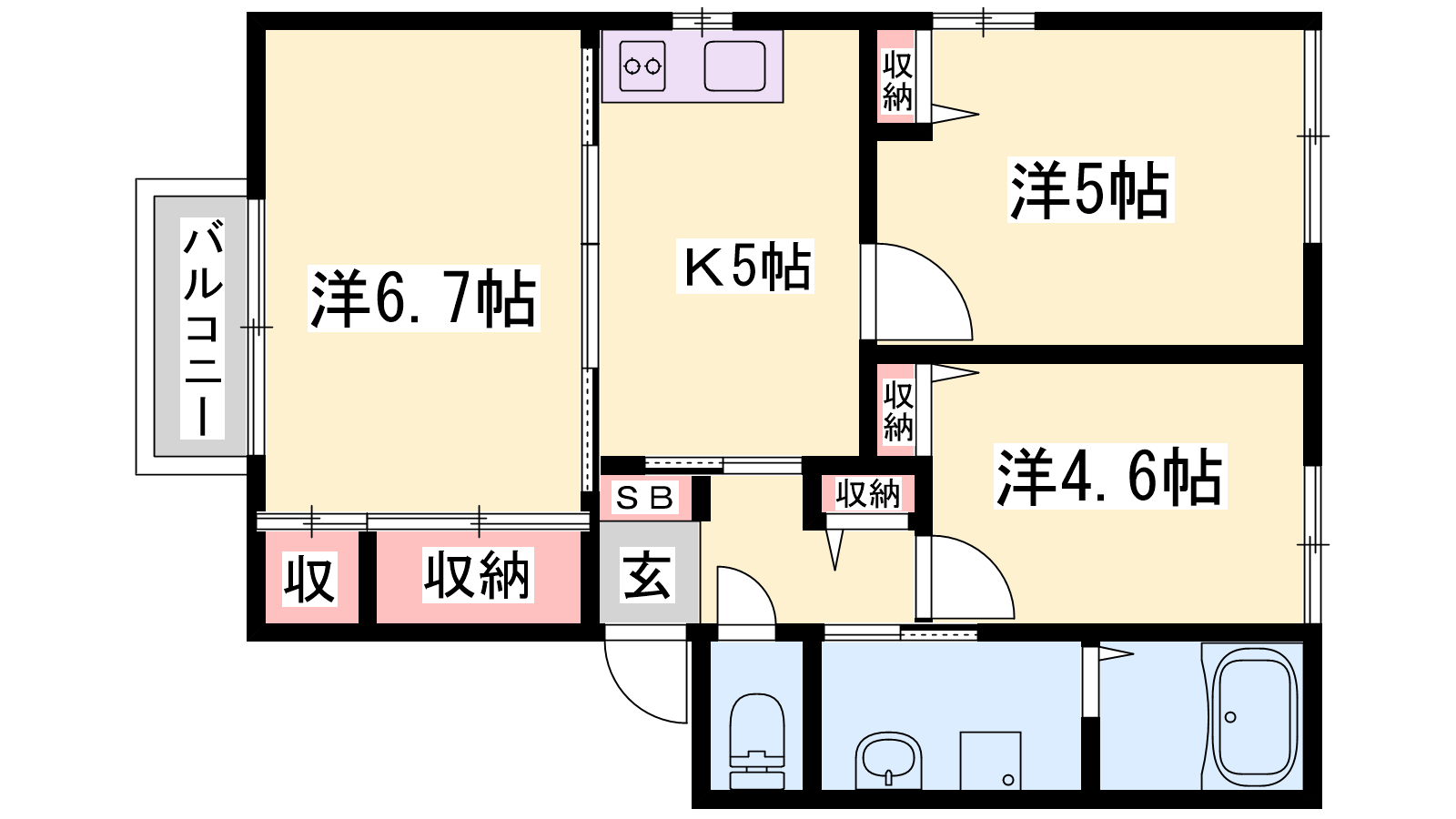 - K5帖、洋室6.7帖、洋室5帖、洋室4.6帖