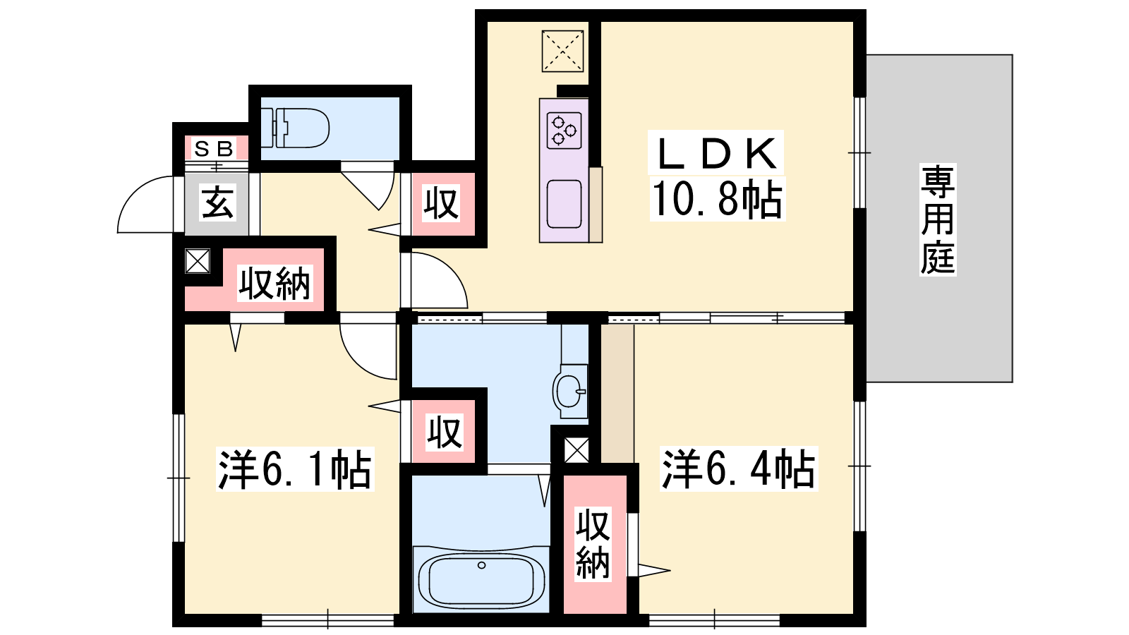 - LDK10.8帖、洋室6.4帖、洋室6.1帖