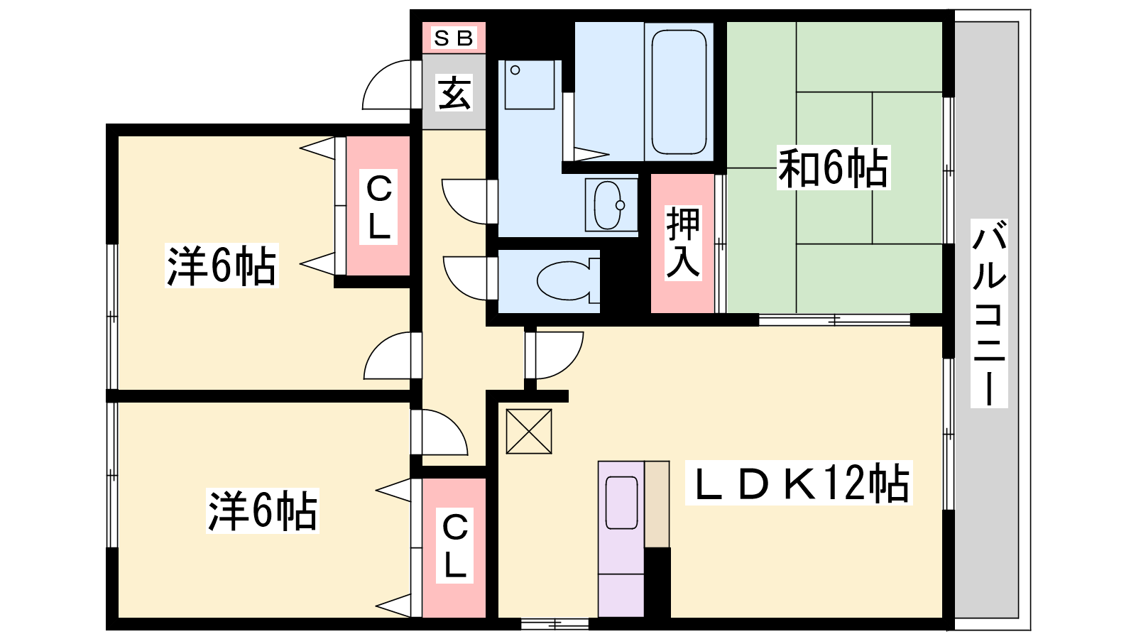 - LDK12帖、洋室6帖、洋室6帖、和室6帖