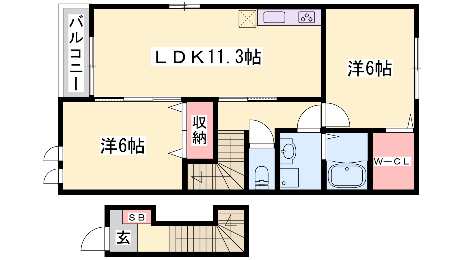 - LDK11.3帖、洋室6帖、洋室6帖