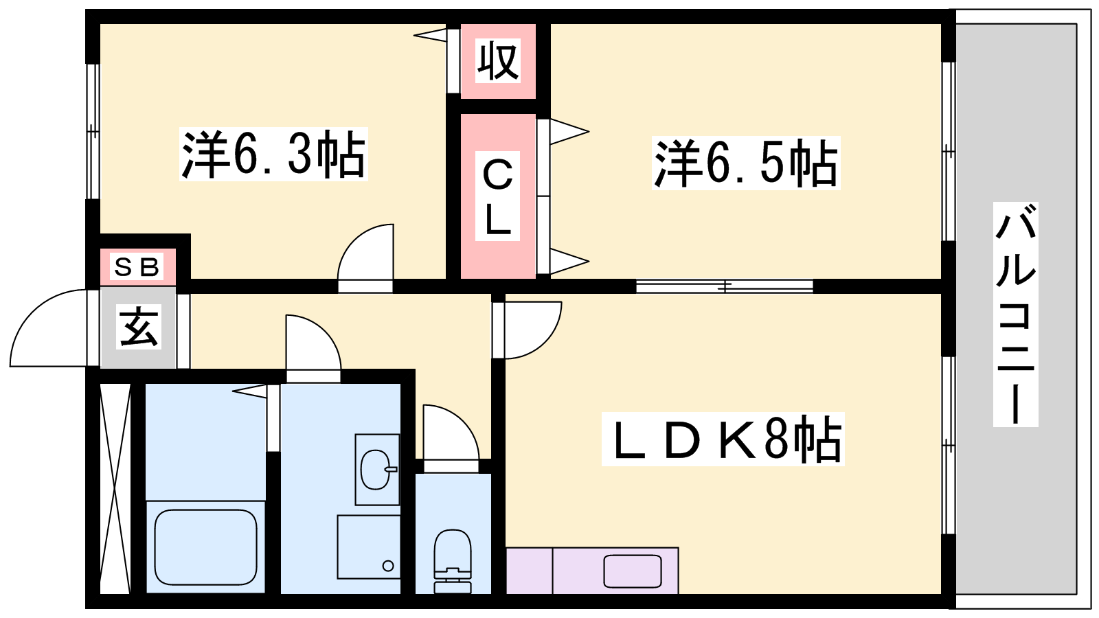 - LDK8帖、洋室6.5帖、洋室6.3帖