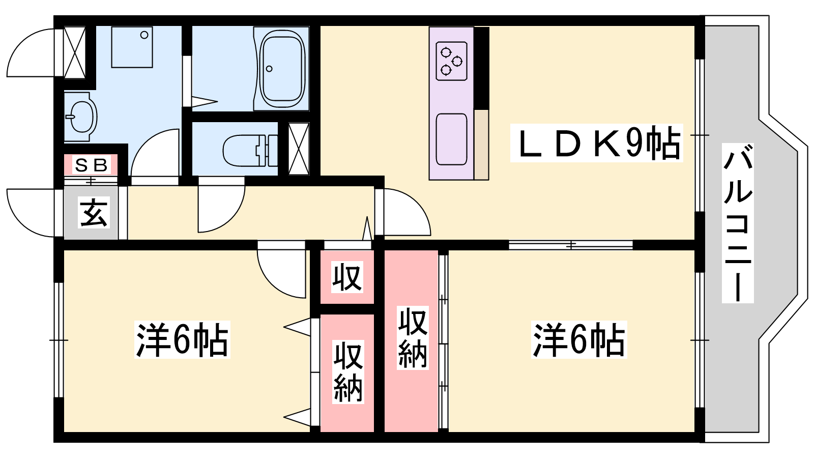- LDK9帖、洋室6帖、洋室6帖